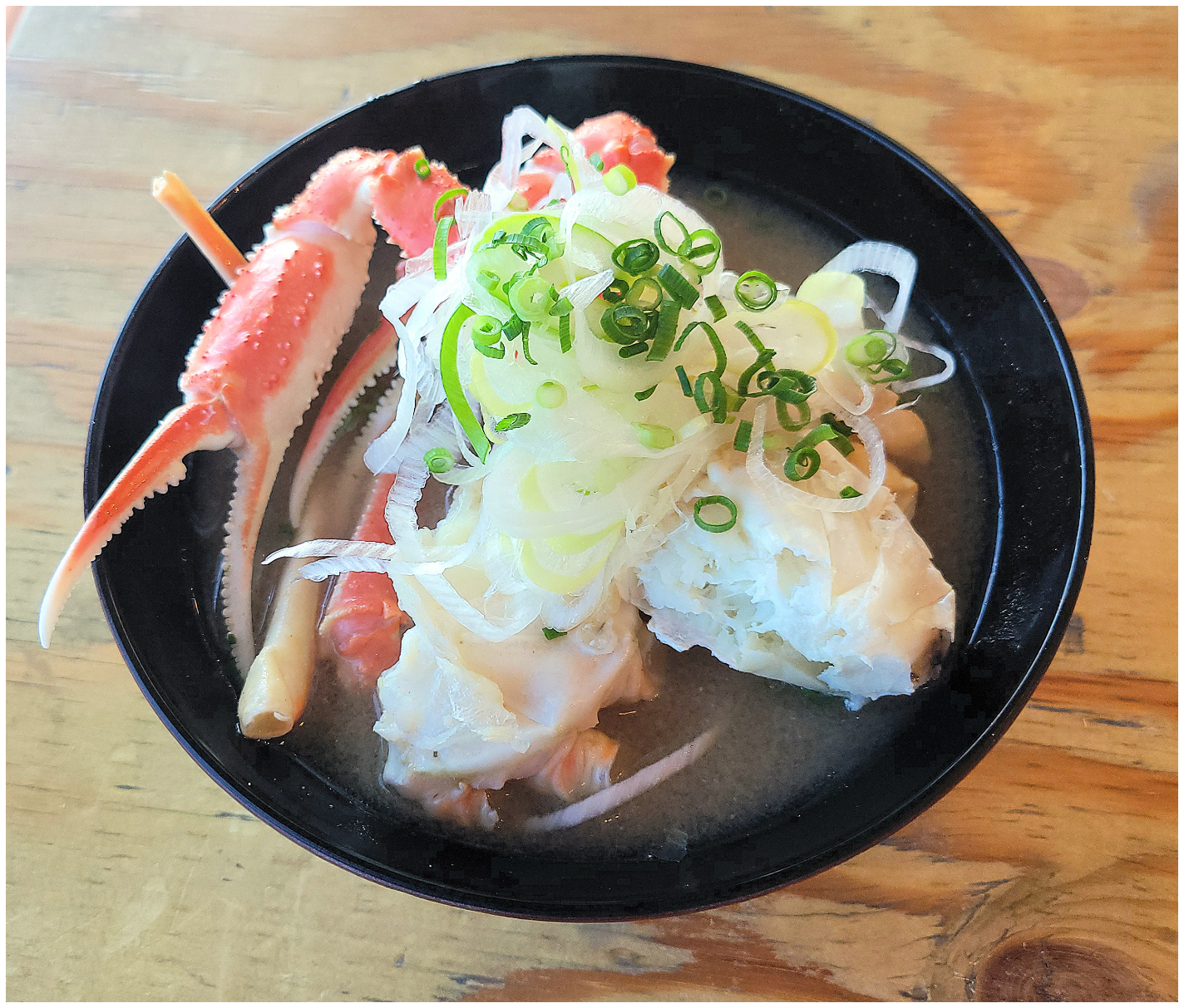 とと丸食堂冬の名物「カニ汁」は、出汁の旨みが濃い“若松葉ガニ”を贅沢に使った温まる一杯。