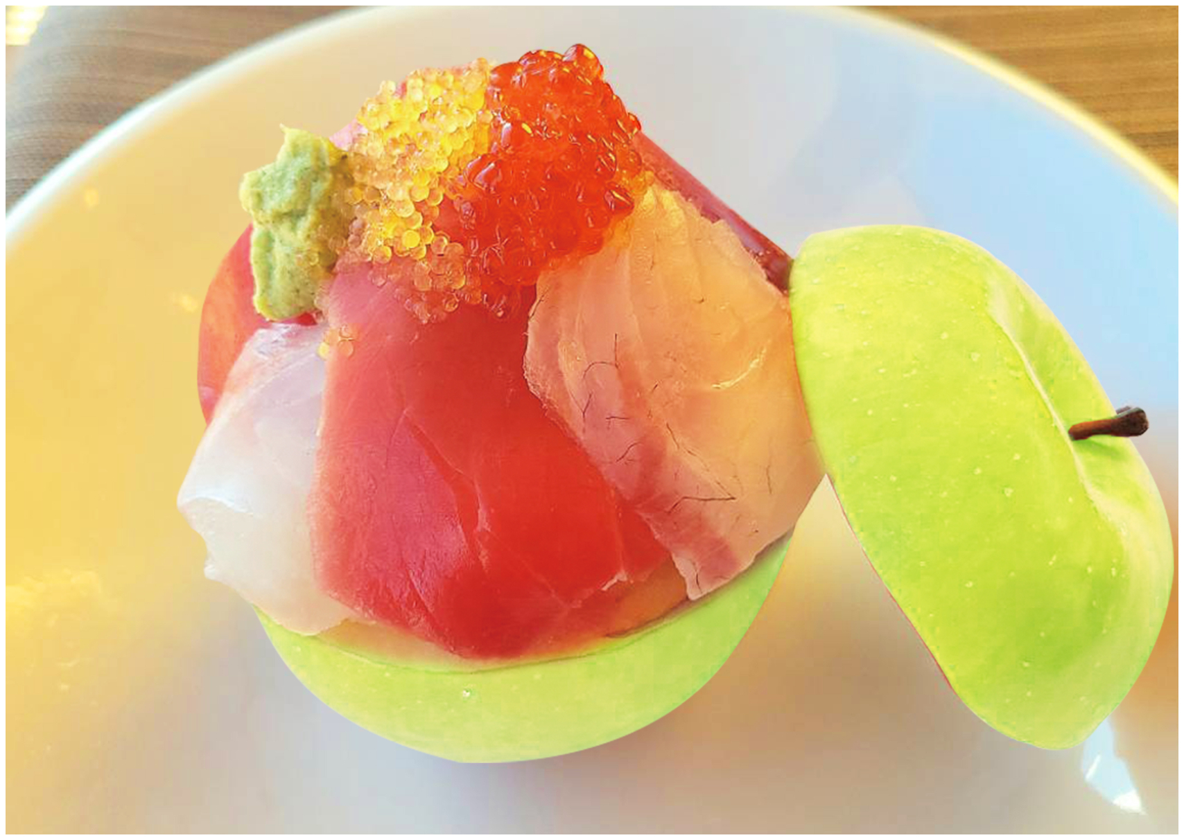 小田原らしい海の幸を「Apple」型の器に盛り付けた、写真にも映える一品。南まぐろと真鯛のコントラスト、とびっこの食感がアクセントになった、紅白の華やかさを楽しめる贅沢丼です。