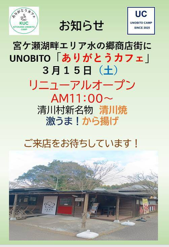 神奈川県唯一の村・清川村の観光地である宮ヶ瀬湖畔園地「水の郷商店街」に、地域創生事業を展開する合同会社UNOBITOが運営する「ありがとうカフェ」を3月15日(土)リニュアルオープンします。
