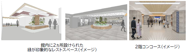 また、環境面では、照明演出やナチュラルテイストの素材使用による明るくにぎわい感のある空間を創出しています。加えて、2階の駅改札コンコースから商業エントランスまでを一体的な空間とし、館内の2ヵ所に緑が印象的なレストスペースを設ける等、心地よい空間への導入も演出しました。
