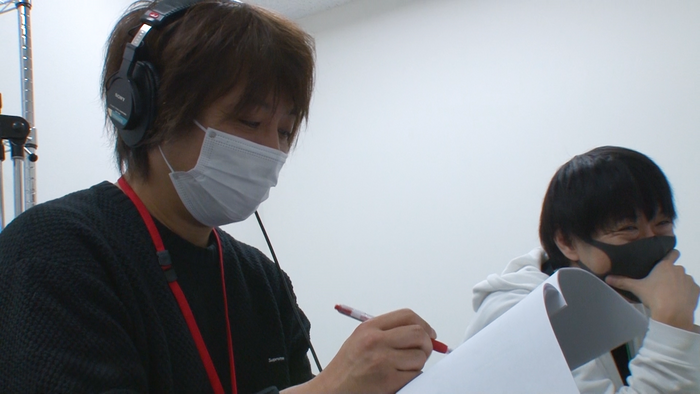 この日、声優タレント科2年の高須賀さんと、アニソンアーティスト科2年の金子さんがアフレコの練習をしていました。大事なのは登場人物の声の“使い分け”。講師の竹下さんのアドバイスを受けた後、プロの現場と同じように録音しながら演じます。
