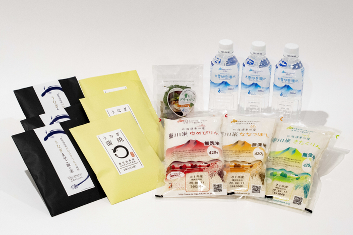 ゆめぴりか、ななつぼし、きたくりん各420g×1個、山椒0.2g×12袋、大雪旭岳源水500㎖×3本、東川ドライベジ(軟白みつば)×1袋、大崎鰻の蒲焼2切入×3個、大崎鰻まぜご飯の素2個入×3個 6,000円(税込)