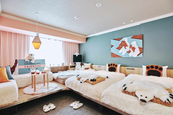 2020年11月に販売開始以降、「可愛い、癒される」と好評をいただいた「シロクマルーム」が、今年も期間限定で「シロクマバレンタインルーム」に進化します。シロクマのもふもふ感が感じられるシロクマルームが、バレンタイン仕様になることでさらに可愛らしい設えになります。お揃いの「シロクマルームウェア」を着たり、写真を撮影したり、女子会を満喫する仕掛けが満載の客室です。