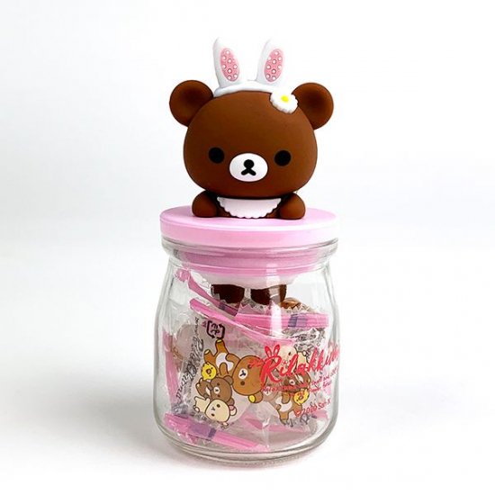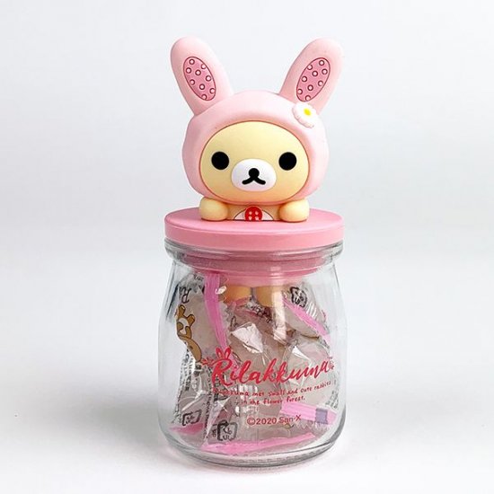 ピンクのフタ上に、チャイロイコグマがウサミミをつけて覗いているようなデザインのボトル入りキャンディです。