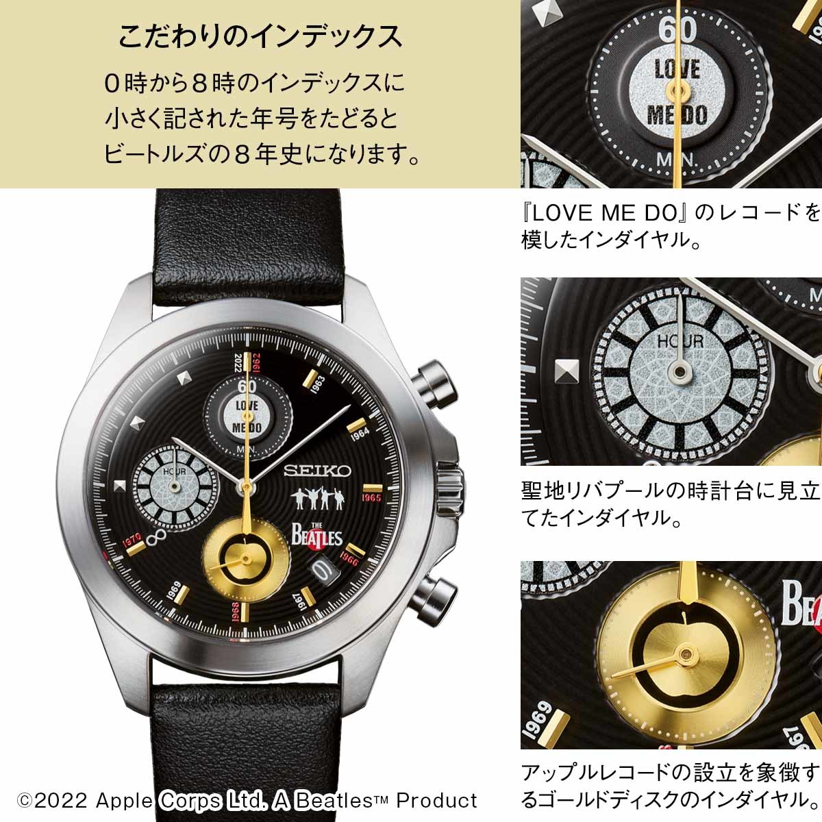 3つのインダイヤルは、『LOVE ME DO』のレコード、聖地リバプールの時計台、1968年のアップルレコード設立を象徴するゴールドディスクをそれぞれイメージ。