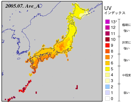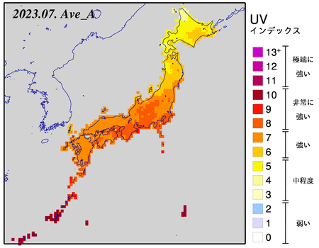 出典:「日最大UVインデックス(解析値)の月平均値全国分布図」 ※気象庁ホームページより(https://www.data.jma.go.jp/env/uvhp/link_monthly_uvindex_ana.html