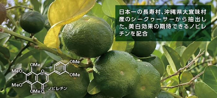 1、大宜味村産シークヮーサーから抽出した琉球大学の特許成分「ノビレチン※」をたっぷり配合 (※琉球大学 特許2014-540773号)