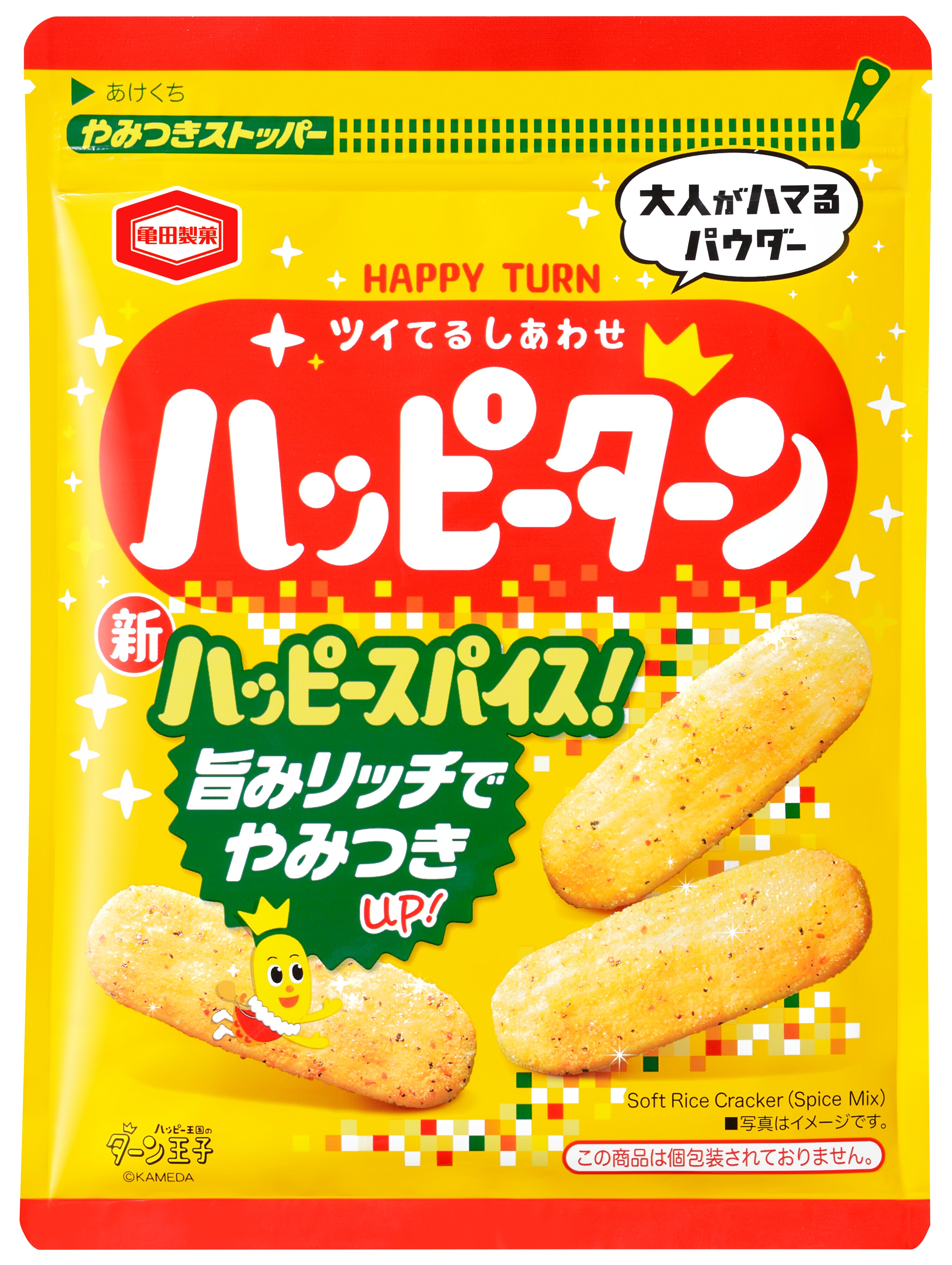 「みんながハマる」あまじょっぱいパウダーが特徴の 『ハッピーターン』に対し、『ハッピーターン スパイス』は、8種のスパイスをオリジナルブレンドした、お酒にも合う「大人がハマる」味わいが特徴の商品です。あえて個包装にはせずチャック式の袋を採用しており、我慢することなく次から次へと一心不乱に食べ進めてしまうこと間違い無しのおいしさです。