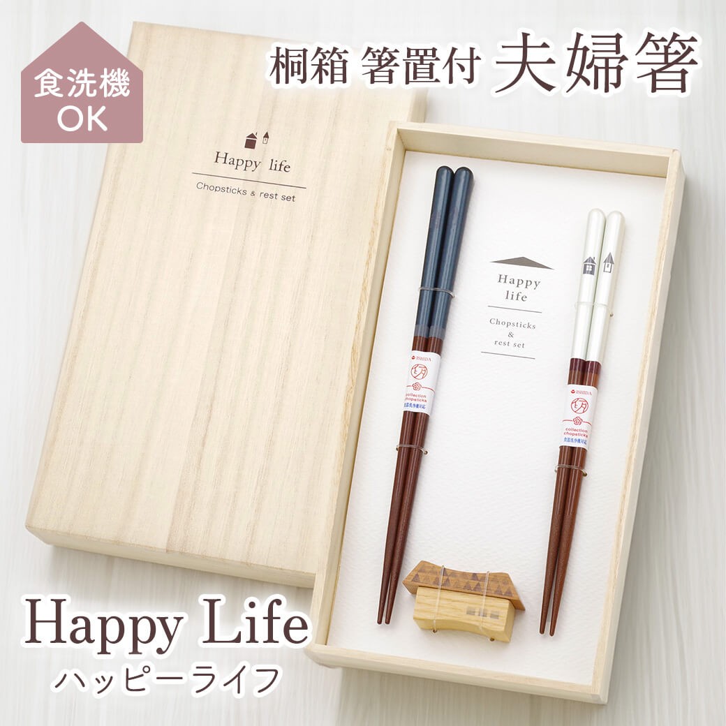 <b>「桐箱 箸置付 夫婦箸 ハッピーライフ」</b>