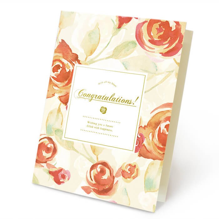 暖かな色合いのバラとゴールドの箔押しが印象的な、上質感のあるカード電報。