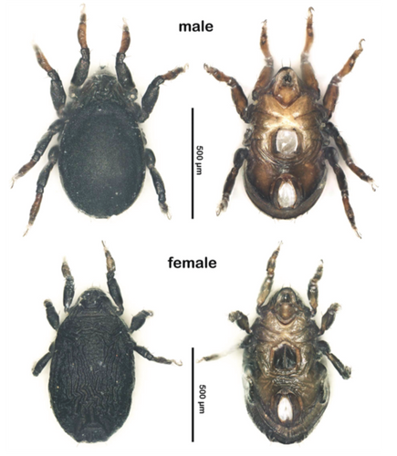 イワドハマベダニの画像。オス(上段)メス(下段)。