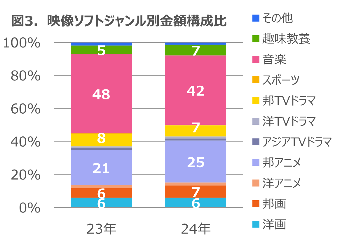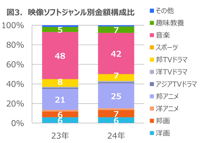 ジャンル別の金額構成比では音楽が最大ジャンルとなったが、好調であった前年から6%ポイント縮小の42%となった(図3)。その一方で、映画『THE FIRST SLAM DUNK』などのリリースがあった邦アニメが構成比を4%ポイント伸長させた。この2ジャンルで市場の67%を占めている。