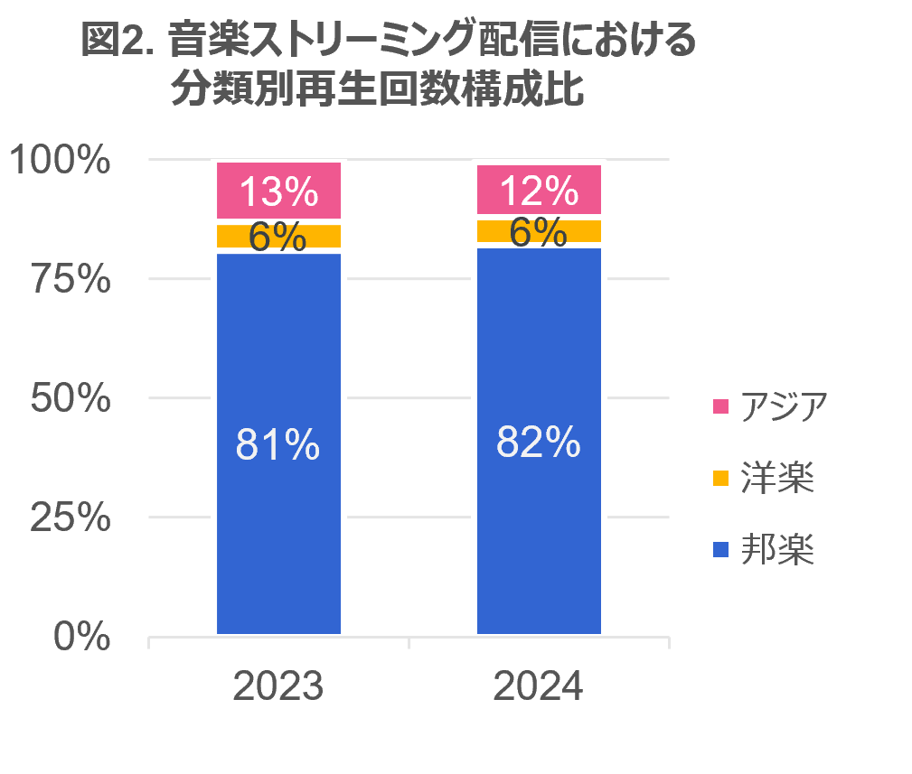・ジャンル別再生回数構成比で邦楽が82%で1%増