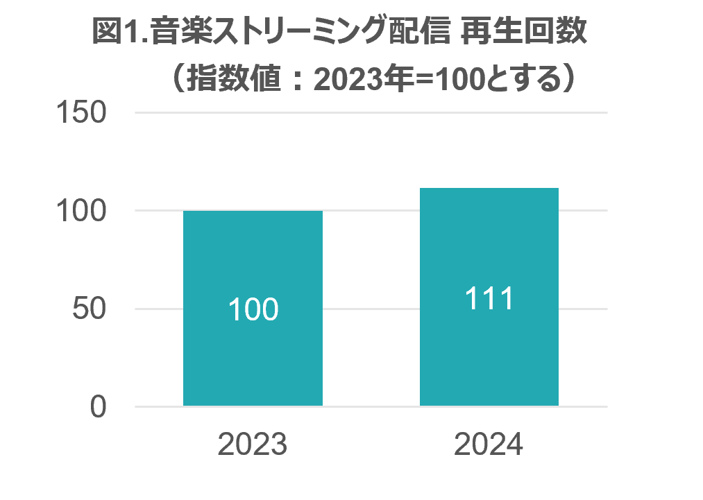 市場は、伸長率が減少傾向であるものの、2024年の総再生回数は前年比11%の伸びとなり増加であった(図1)。