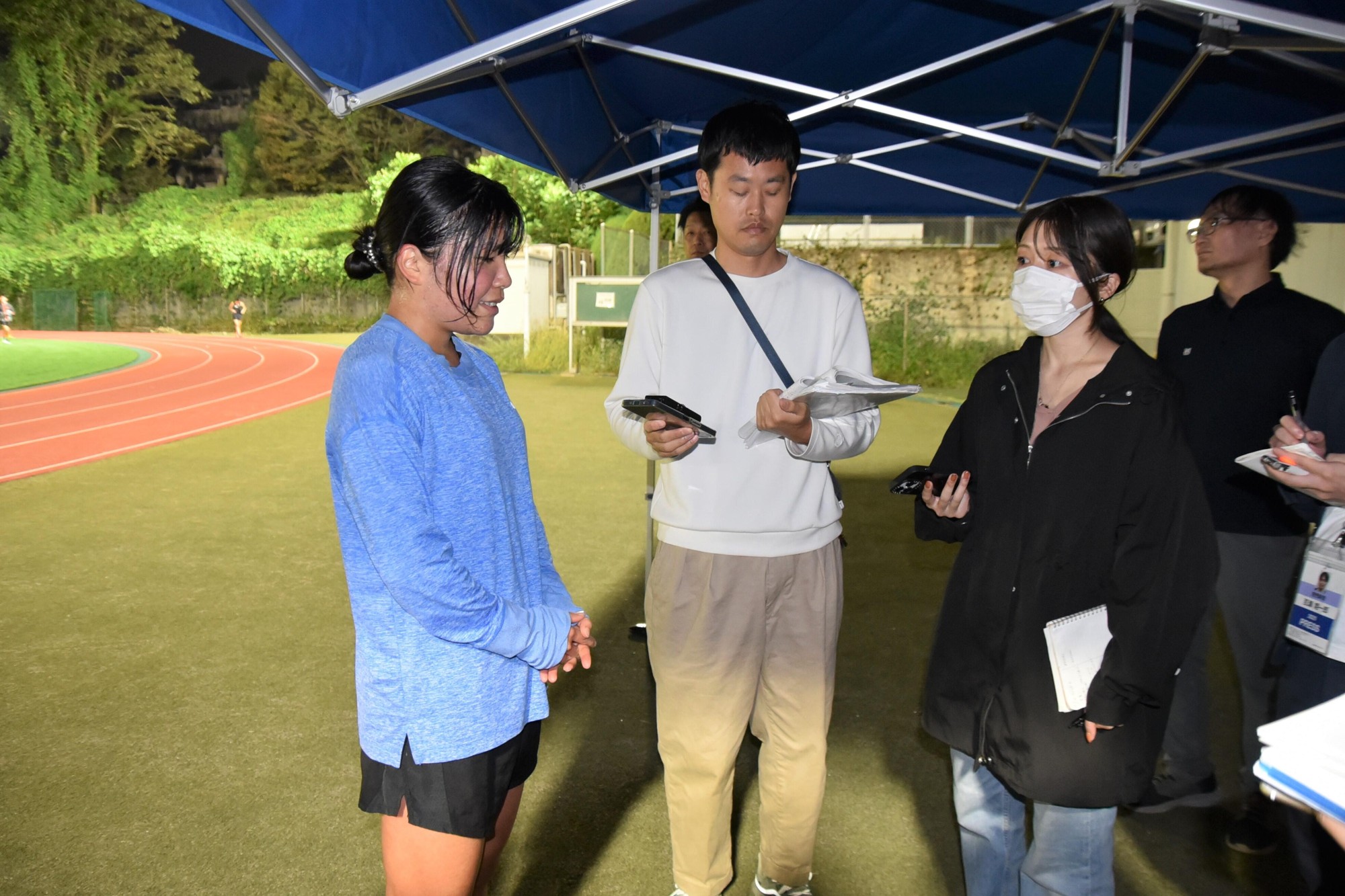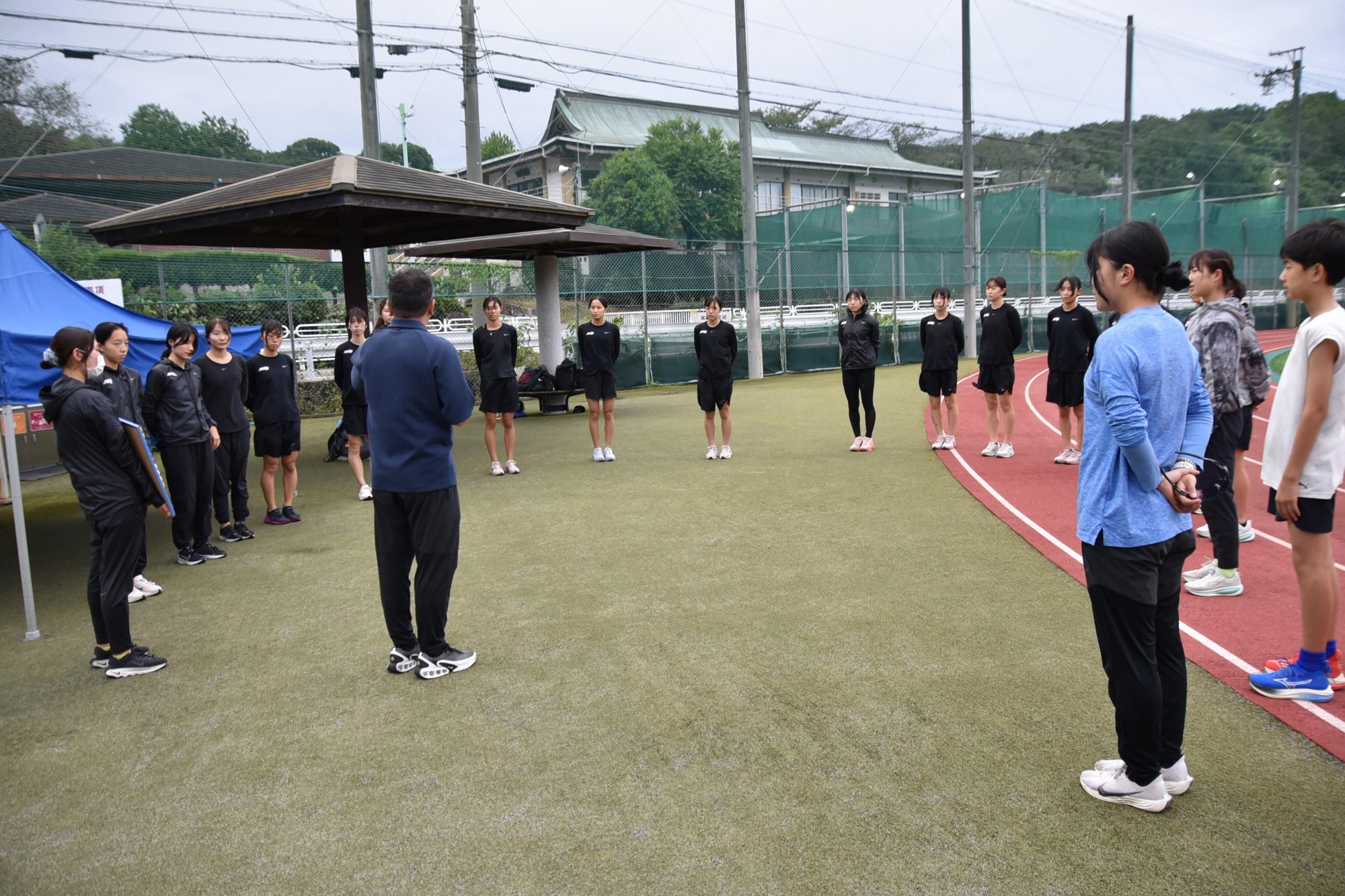 取材会では、集まった一般紙やスポーツ紙、テレビ局など6社の記者やカメラマンにアップや走り込みなどの練習を公開。米田監督と米澤奈々香キャプテン(人間学部4年)、細見芽生選手(人間学部1年)、石松愛朱加選手(人間学部4年)、大河原萌花選手(法学部4年)、村岡美玖選手(法学部3年)がそれぞれ個別のインタビューに応じ、記者からの質問に答えました。