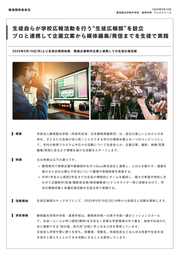 静岡聖光学院中学校・高等学校は、広報活動を生徒主体で行う「生徒広報部」を設立。中学1年から高校2年までの生徒が、企画・撮影・取材・シナリオ作成・編集などの役割を分担し、実践的な広報活動を展開します。映像制作会社Docs株式会社(静岡市)と連携し、プロの技術や発信ノウハウを学ぶことで、生徒目線でリアルな情報発信力を育成。学校と地域・企業との接点を創出し、次世代の「伝える力」と「協働力」を育みます。