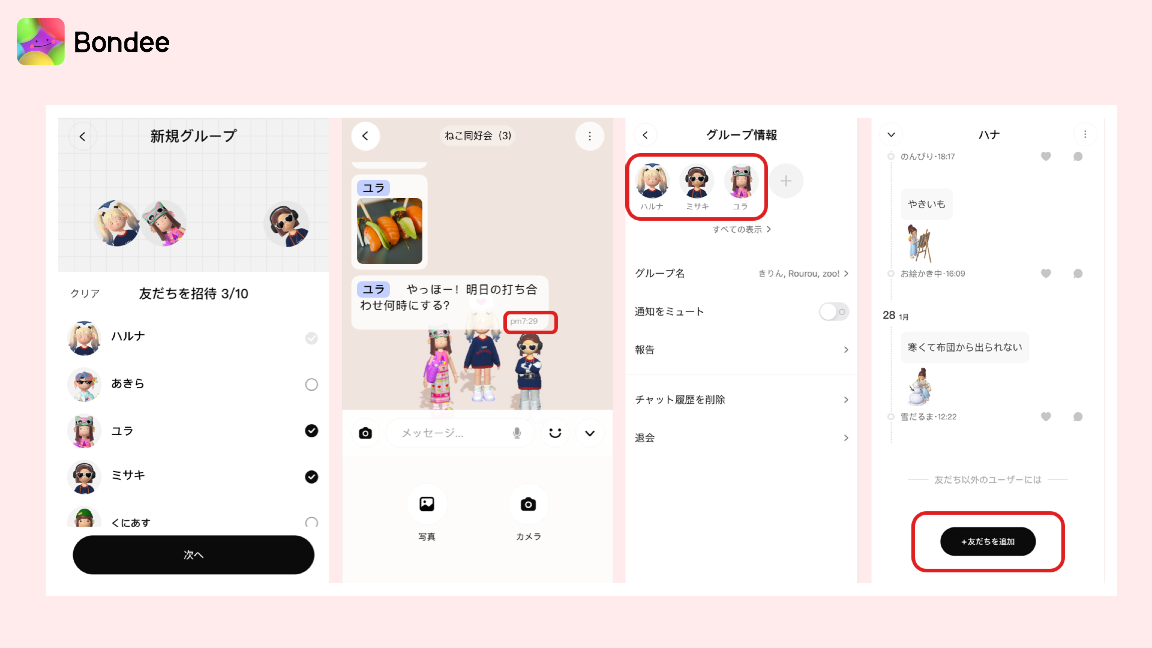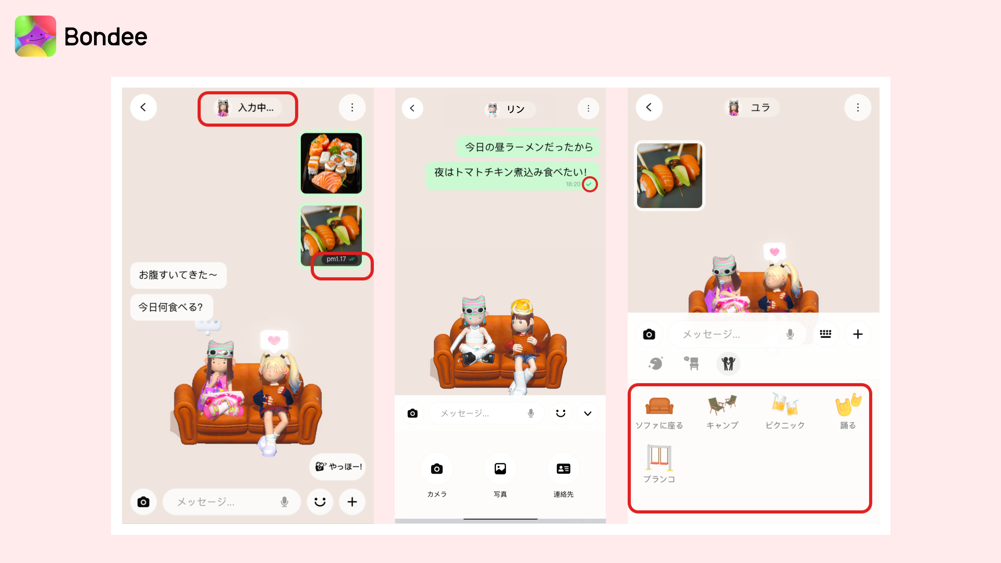 1対1ではテキストのほかに、テキスト入力部分の右側の+ボタンからカメラ撮影、音声メッセージ、既存の写真送信、Bondeeの友だちを紹介することが可能です。