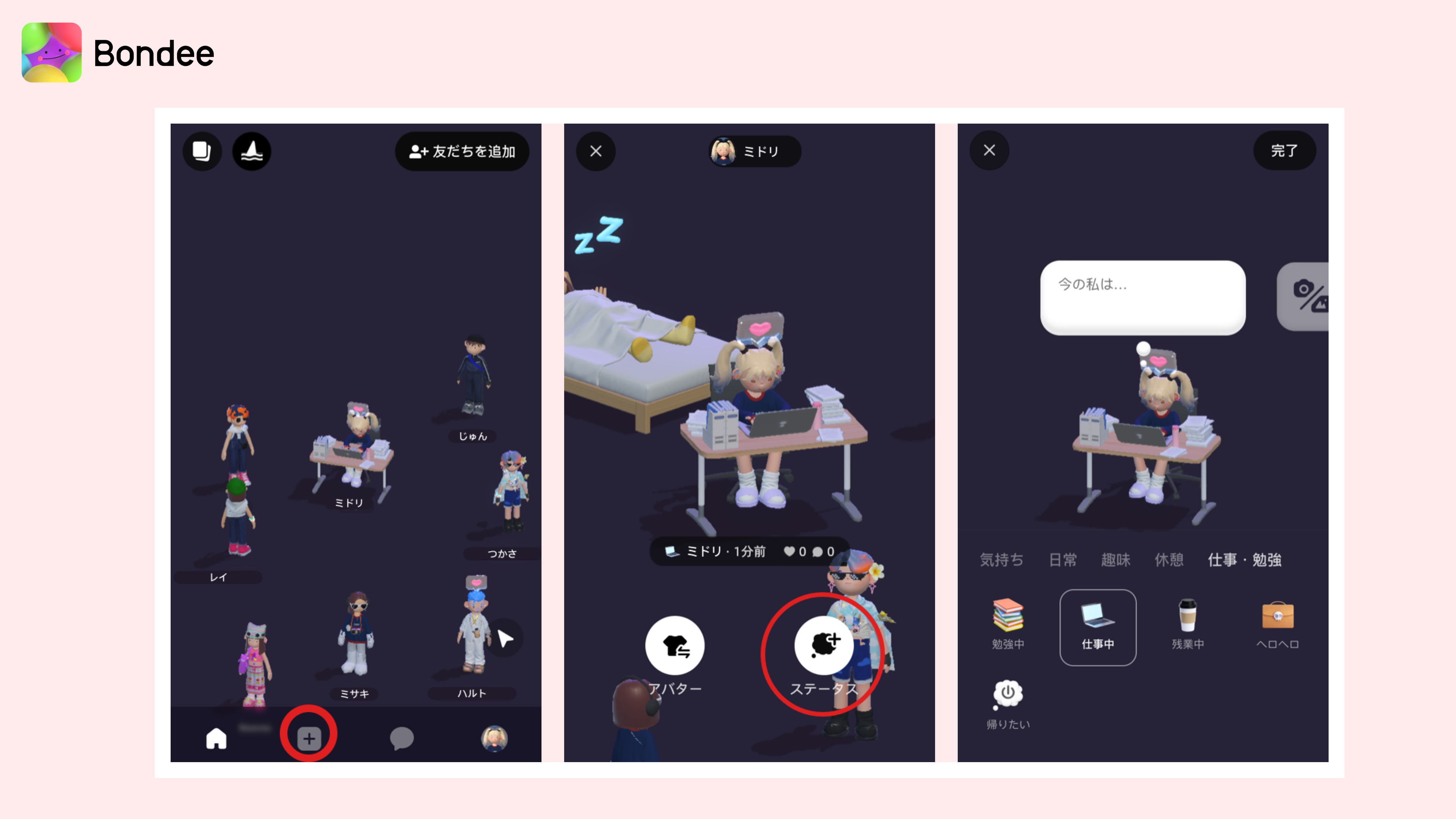 『Bondee ボンディー』は、自分のアバターを作成し、50人の友だちと密なコミュニケーションができる次世代メタバースSNSです。