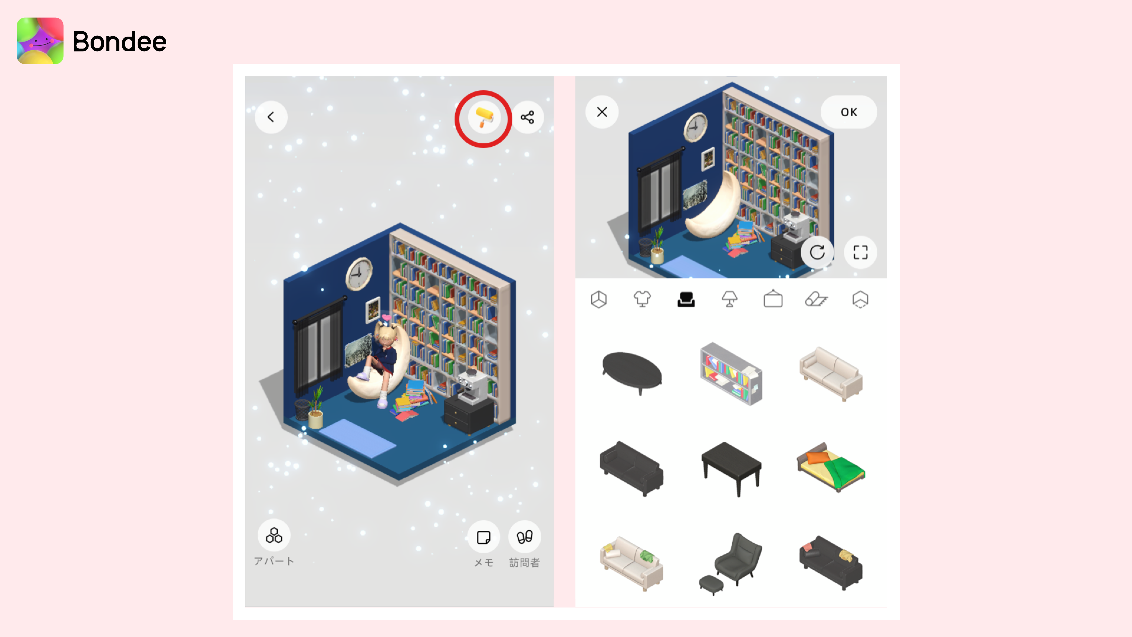 アバターが生活する部屋を作ることができます。壁紙と床、窓、本棚、机やベッド等のインテリア、ぬいぐるみや散らばった本など個性的なアイテムもあります。部屋のBGMや演出で雨を降らせたり、蛍の光を再現したり、ライトを朝昼夜に調整することも可能です。