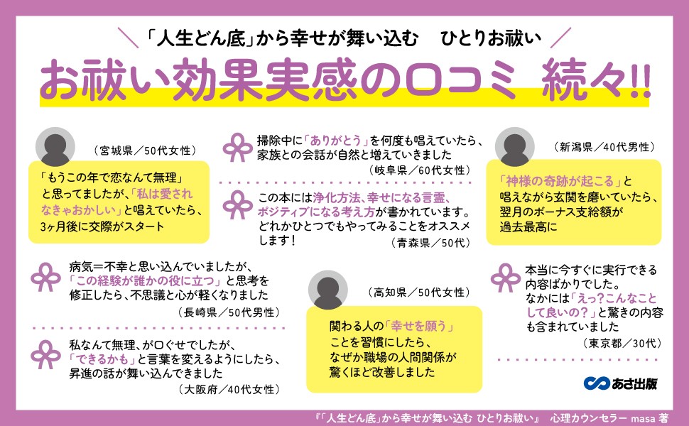 株式会社あさ出版(代表取締役:田賀井弘毅、所在地:東京都豊島区)は心理カウンセラー masa著『「人生どん底」から幸せが舞い込む ひとりお祓い』https://www.asa21.com/book/b657433.html が、3月27日の重版をもちまして、累計3万部を突破したことをお知らせいたします