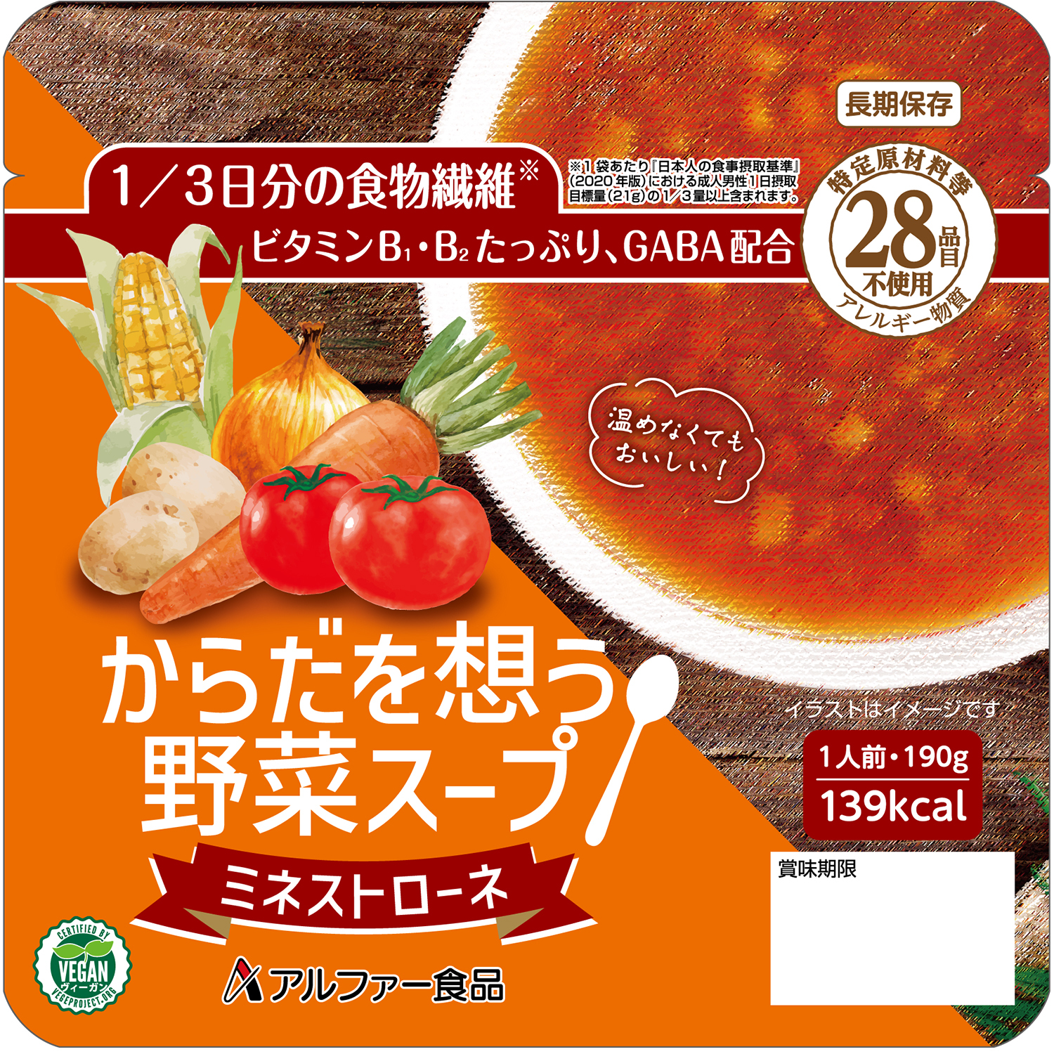 アルファ化米を主軸に加工米飯の製造・販売を行っている、アルファー食品株式会社(本社:島根県出雲市、代表取締役:林 隆史)は、特定原材料等(アレルギー物質)28品目不使用で、温めずにそのまま食べられる長期保存食『からだを想う野菜スープ』シリーズの販売を開始いたします。普段の生活だけでなく、避難時に不足しがちな栄養素や、健康問題を軽減する成分をプラスした「ひよこ豆カレー」・「ミネストローネ」・「和風五目」の3品をラインアップ。