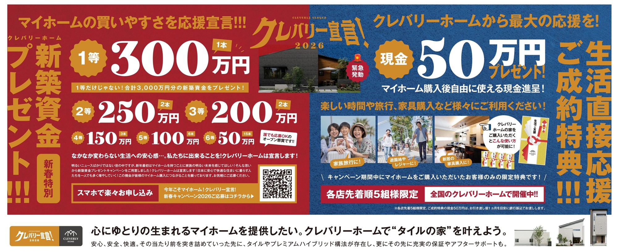クレバリーホームでは、新春キャンペーン期間中の取り組みとして、2026年1月中にご契約いただいたお客様を対象に、各店先着5組様限定で「現金50万円」を進呈する成約者向け特典を設けています。