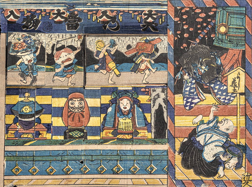 第一部では、天神様、祭礼、相撲、役者、忠臣蔵などをテーマにしたものや、おもちゃ絵を多数出版した版元にスポットを当て、物尽くしや細工物、物語、ゲームなど、さまざまなジャンルのおもちゃ絵約170点を紹介します。