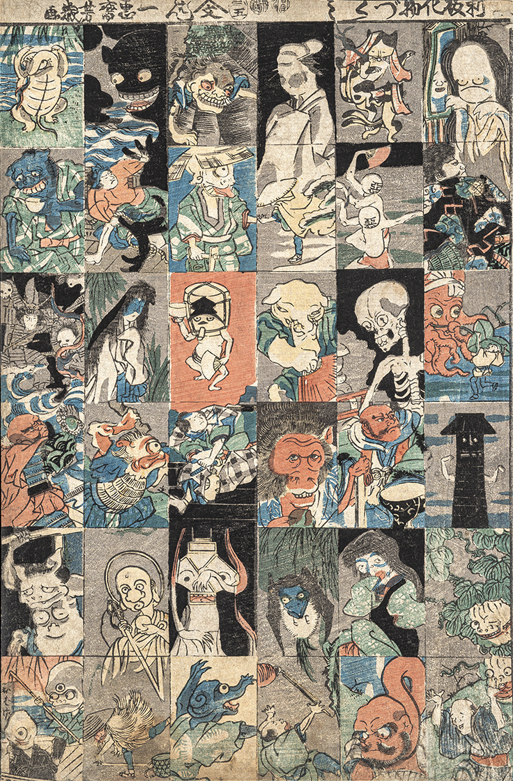 お化けはおもちゃ絵の題材によく取り上げられます。上から二段目には「悪」の顔をした生き物が二体描かれています。これは、人の心のありようを表す魂で、悪魂(悪玉)に取り憑かれると人は悪行を重ねるという考えによるもの。悪魂もお化けとして取り上げられています。