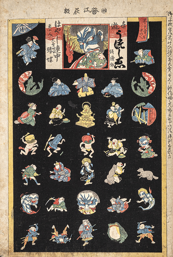 おもちゃ絵の出版が特に盛んになるのは、19世紀半ば以降と思われますが、それ以前におもちゃ絵の版元として目立つのは「江崎屋辰蔵(江辰)」です。