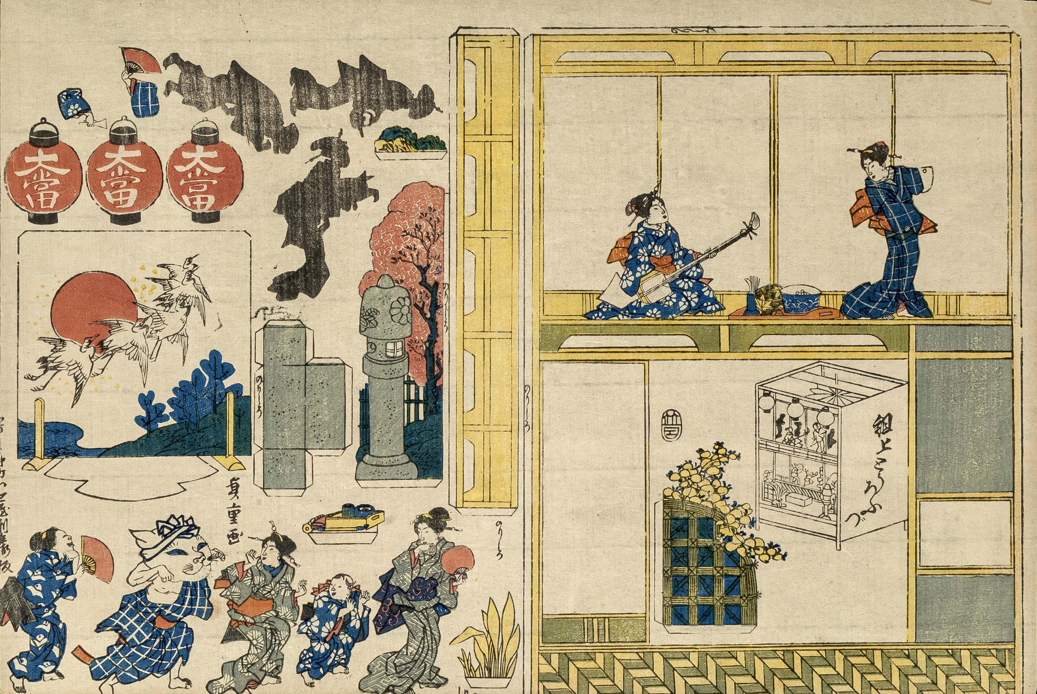 手前に切り抜かれたおもちゃ絵が描かれており、当時の人々の日常に溶け込んでいたことが窺えます。
