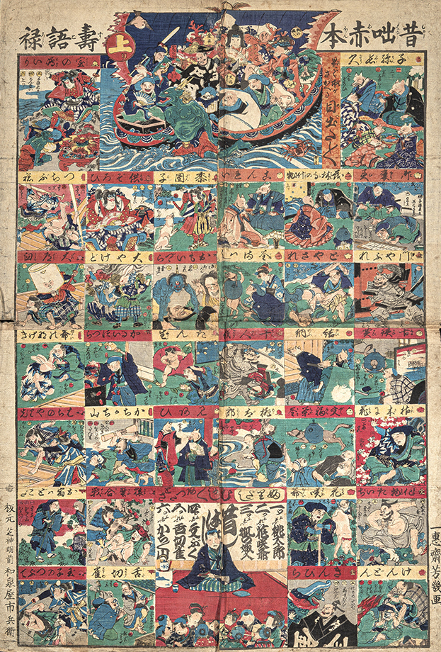 花咲爺、分福茶釜、桃太郎、猿蟹合戦、狐の嫁入りなど、昔話のさまざまな場面がマスになっている双六です。