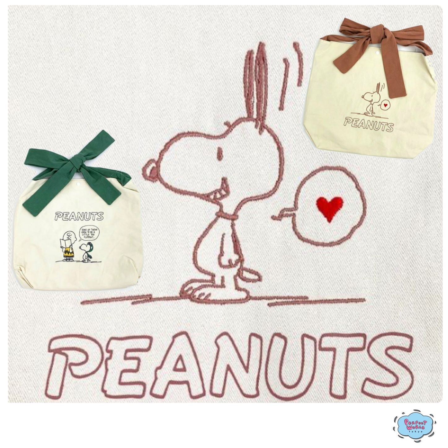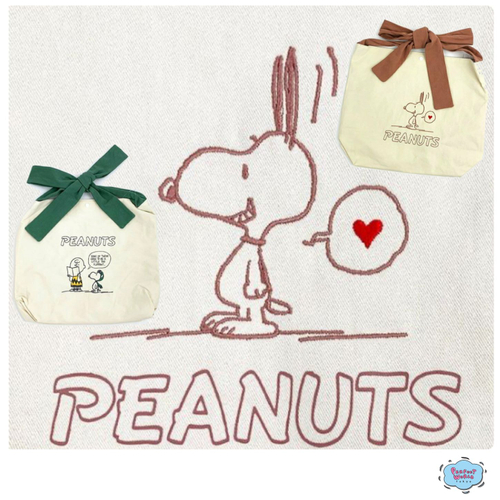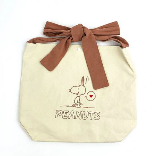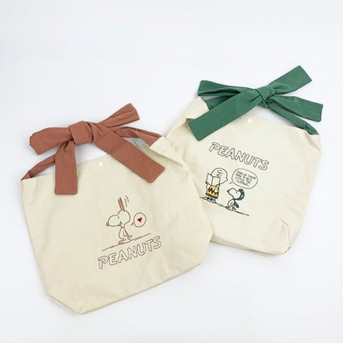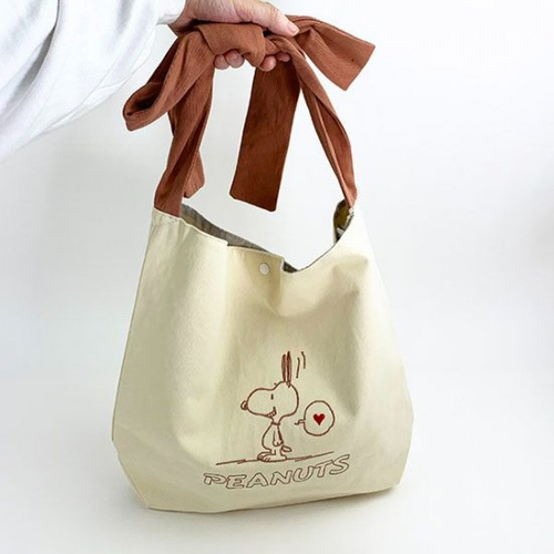 スヌーピーから持ち手がリボンになってるリボントートのご紹介です。バッグのカラーは2カラーご用意しているので、お好みのテイストをどうぞ。スヌーピーのデザインも異なるのでお友達とのおソロコーデにも活躍しそうな風合いです♡