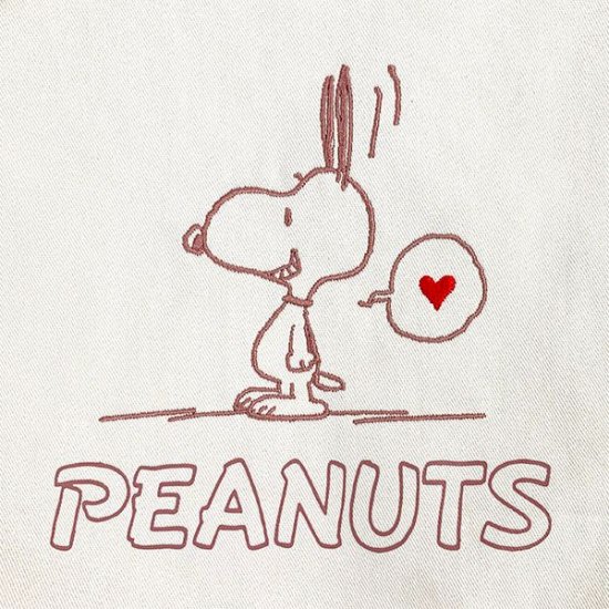 リボンの存在感がバツグンにかわいいリボントートのスヌーピーは刺繍になっています。シンプルなクリームカラーにスヌーピーの刺しゅうが映えて、高見えするんです。カジュアルコーデにも合わせやすいキャラクタートートなんですよ♪