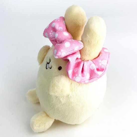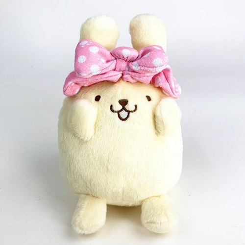 うさぎさんに変身したポムポムプリン☆おててを上にあげて嬉しそうです!ほかのポムポムプリンのぬいぐるみよりも、カラーが優しめでほっこりしますよ♪