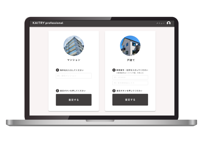 『KAITRY professional』は、業務上、不動産価格の目安調査を必要とされる士業の方々に向け、最短5秒でAIが不動産の一般市場価格(流通価格)を提示し、最短3分で不動産価格調査書の作成を可能とするサービスです。