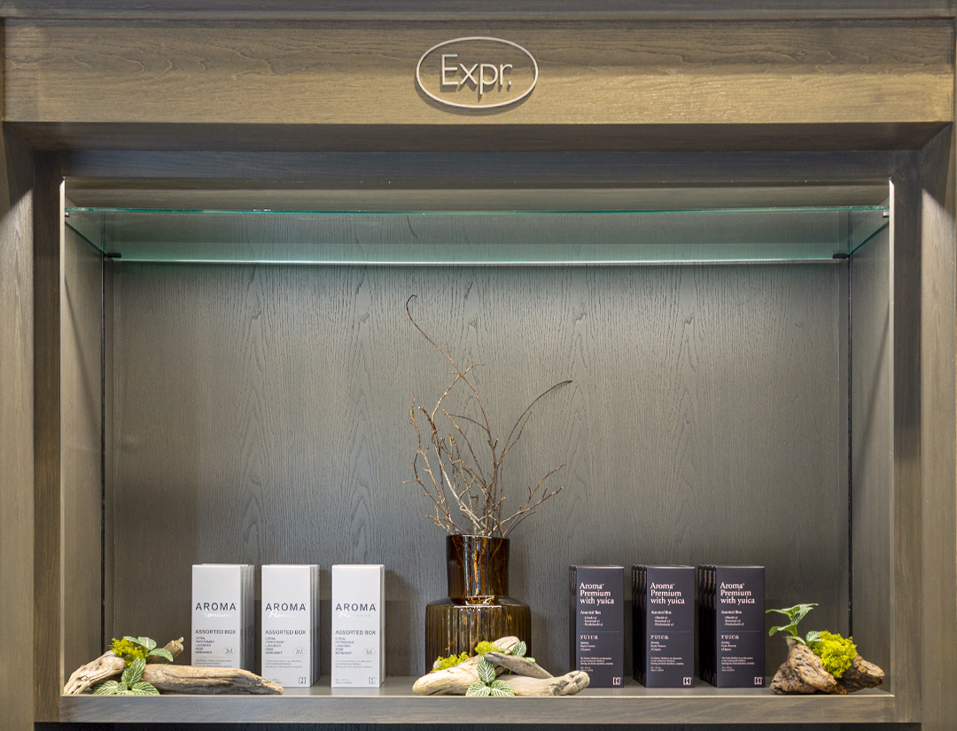 フレンチカフェ&テラス「Expression Kawaguchiko」は、FSXが運営する初の実店舗です。これまでBtoBtoC (Business to Business to Consumer) の事業モデルだったFSXが、食とおしぼりを通じて、直接地域やお客様と繋がる場所として今年の7月に開業しました。FSXの製品やサービスを体験していただけるショールーム機能も兼ね備えた店舗設計になっており、実際に『AROMA Premium』の香りを確かめ、アソートBOXを手に取って購入いただけます。また日本最大級のおしぼり通販サイト「イーシザイ・マーケット」でも販売を開始します。