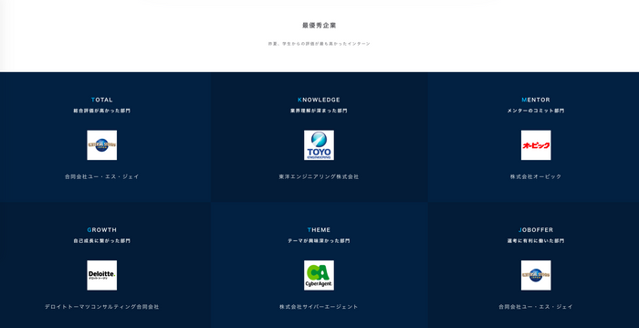 学生がインターンシップに参加する際に特に重視する「総合評価」「業界理解」「メンターのコミット」「自己成長」「テーマの面白さ」「内定直結度」の6項目において評点を集計し、上位5企業を選出しています。