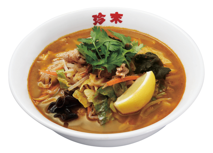 「トムヤムタンメン」は、世界3大スープのひとつといわれる「トムヤムクン」(※1)がベース。プリッキー(唐辛子)の辛味とレモングラスを使った特徴的な酸味にハーブやナンプラーを珍來流にアレンジ。スパイシーで複雑な旨味のスープに珍來自慢のオリジナル麺が絡み合い一度食べたらやみつきになるほど後を引く美味しさを秘めた熱い夏にピッタリの自信作です。※1「トム」は煮る、「ヤム」は混ぜる、「クン」はエビ。「トムヤムクン」はエビ入りトムヤムスープという意味ですので「トムヤムタンメン」にはエビが入っていないことをご理解下さい。