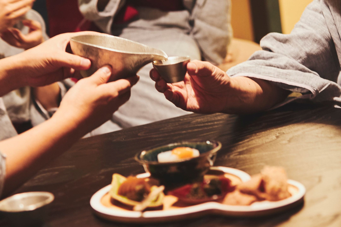 この会席には、約800℃に熱した焼き石を使い、湯気が龍神のように立ち昇る一品が登場します。伊勢海老や牛ロースとともに、巻き湯波や三年味噌なども楽しめます。この料理には天鷹酒蔵の「しぼりたて生原酒」をペアリング。新酒のふくよかな甘味が、牛と海老の旨味に絡みます。