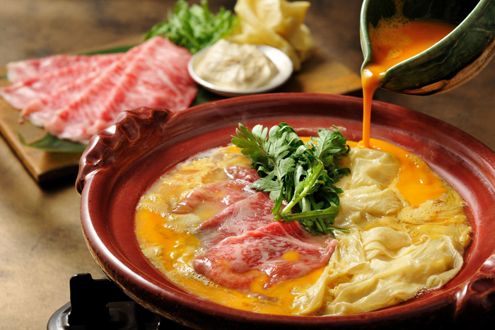メイン料理である和牛と湯波の柳川仕立て鍋は、和牛と湯波を甘辛い出汁と卵でお召し上がりいただくもの。この一品には、惣誉酒蔵の「初しぼり(生)」をペアリングしています。新酒初しぼりらしい懐の広い味わいが、和牛の豊かな風味と湯波のまろやかな食感の両方を、うまく引き立たせてくれます。
