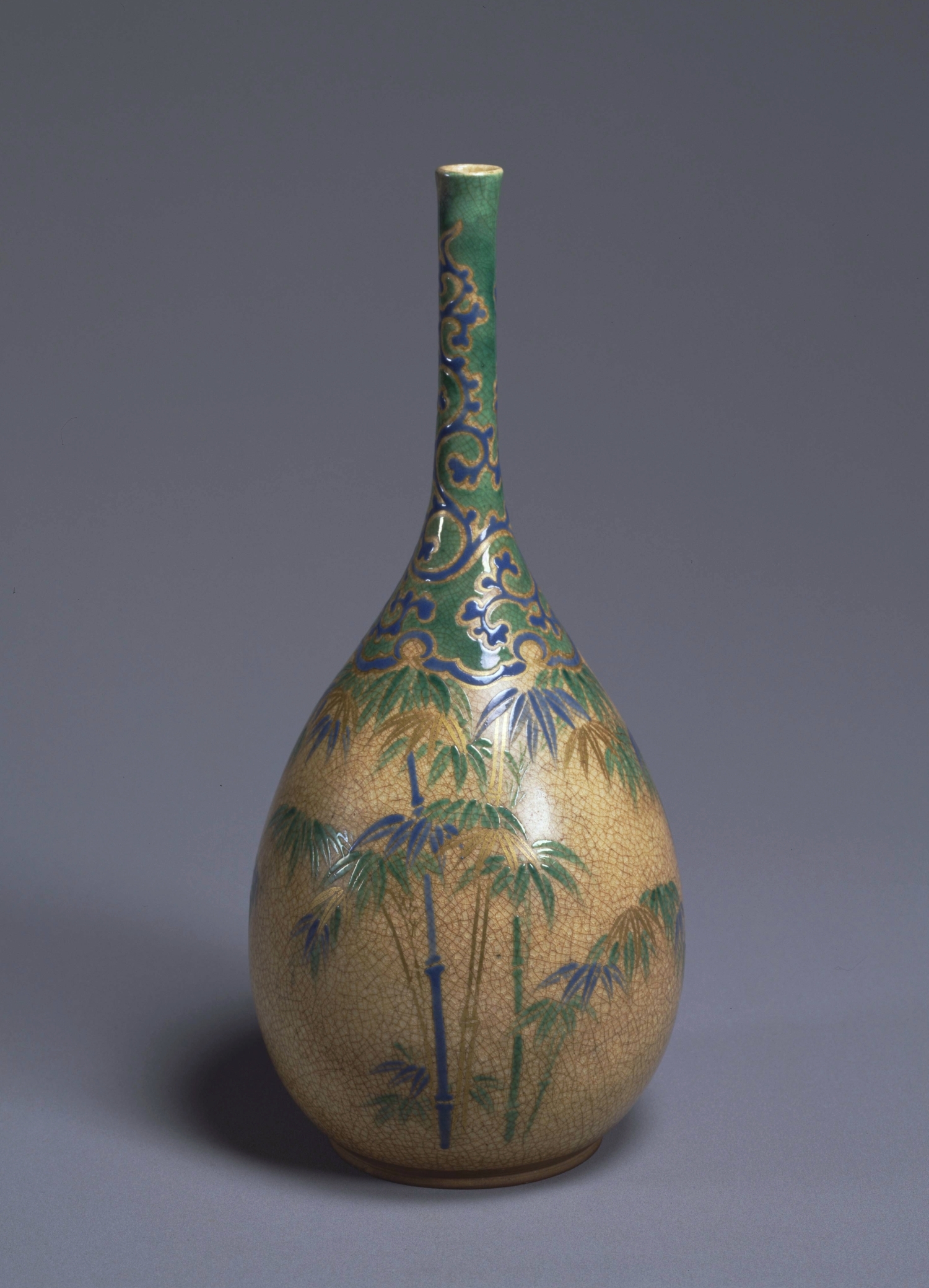 作品詳細:精緻な轆轤のわざによるすらりと伸びた頸部が印象的です。京焼のなかでも、卵色の素地に緑と青、金彩の三色で彩った一群は「古清水(こきよみず)」と呼ばれます。