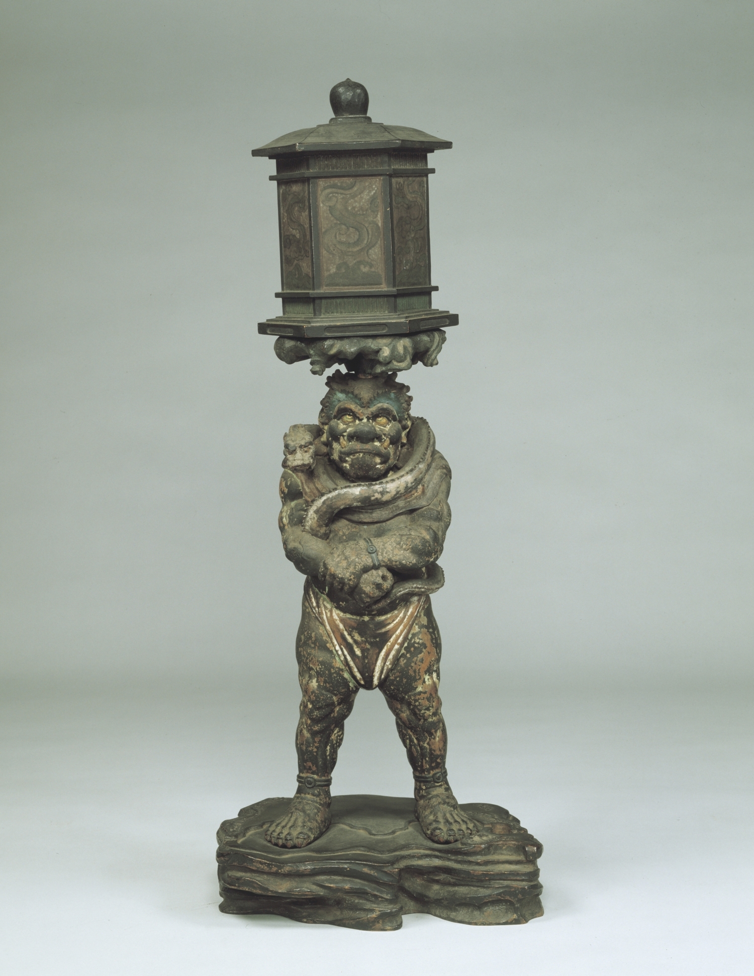 作品詳細:右手で上半身に巻きついた龍の尻尾をつかみ、頭に乗せた燈籠をにらんでいます。興福寺の国宝の像の1/2模造です。