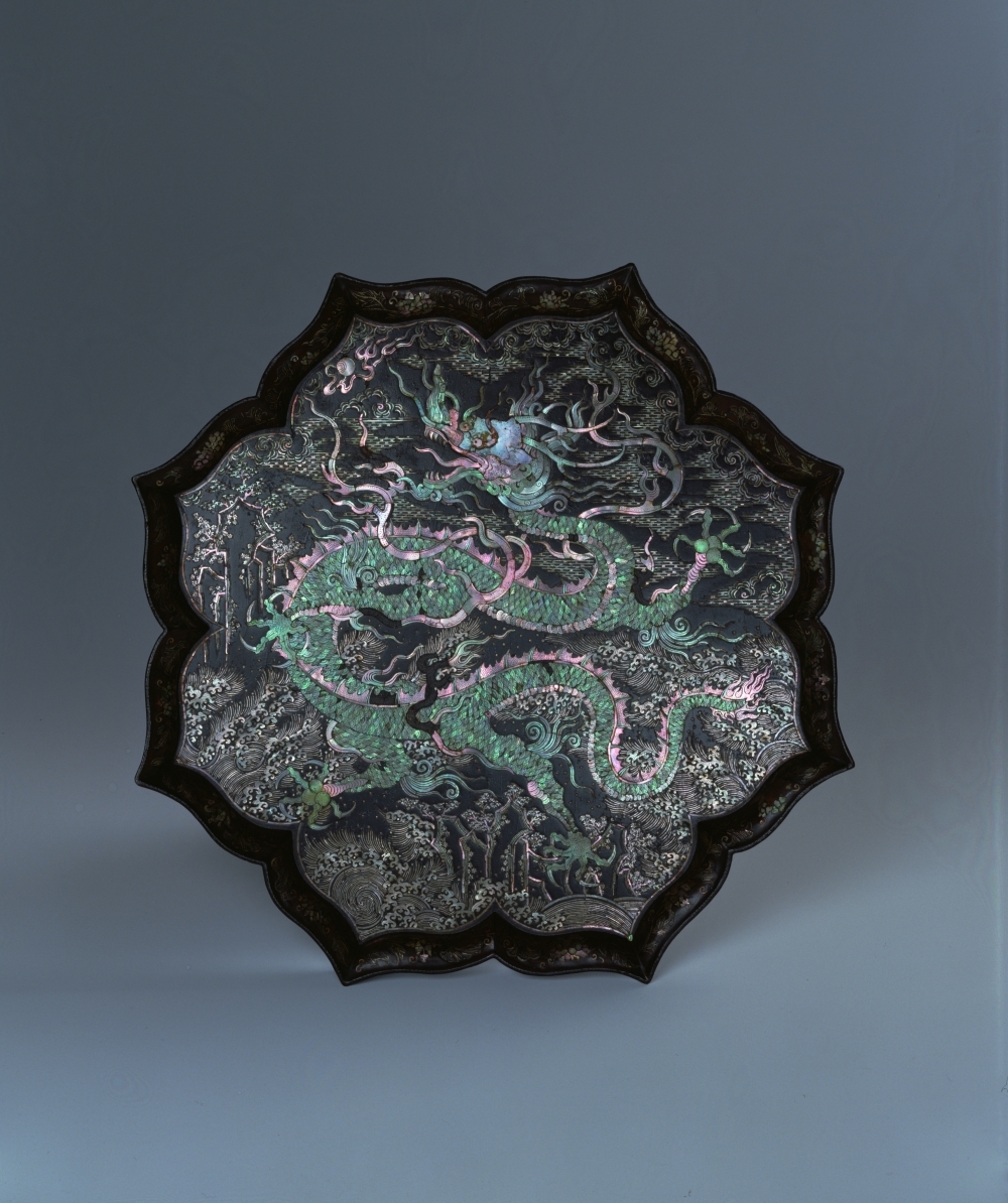 作品詳細:螺鈿によって、5本の爪をもつ龍が体を大胆にうねらせている姿が表されています。龍の鱗や、躍動する波がしらを見ると、貝を緻密に加工する高度な技術が用いられていることがわかります。