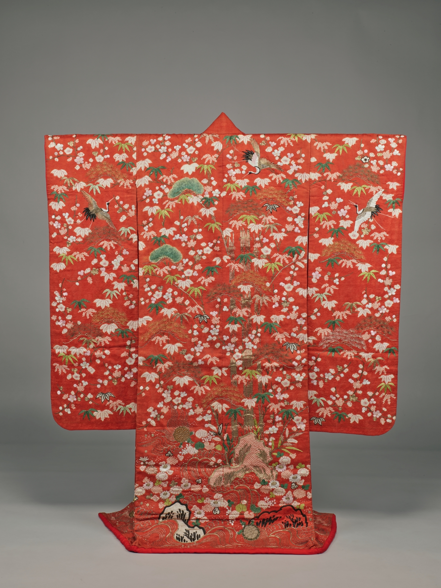 作品詳細:綸子地に、縫い締め絞りや鹿の子絞りで模様を白く染め抜いて紅地に染め、金糸や絹糸で松竹梅や鶴亀などの吉祥模様を表した振袖の打掛です。