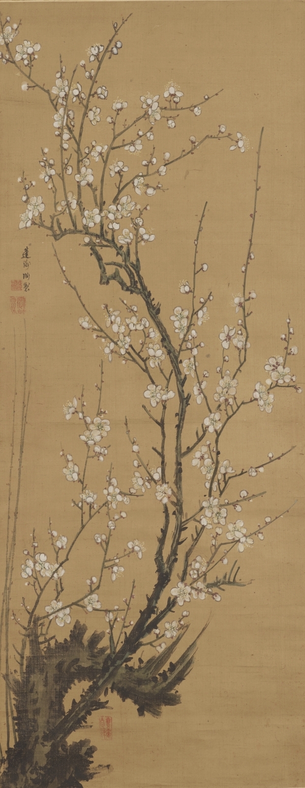 作品書斎:下が透けるような荒い絹に、白梅が伸びあがり咲く様子が描かれています。作者の百川は名古屋に生まれ、舶載の中国画や画譜を学びながら絵を描き、俳諧もよくした日本文人画の先駆者の一人です。