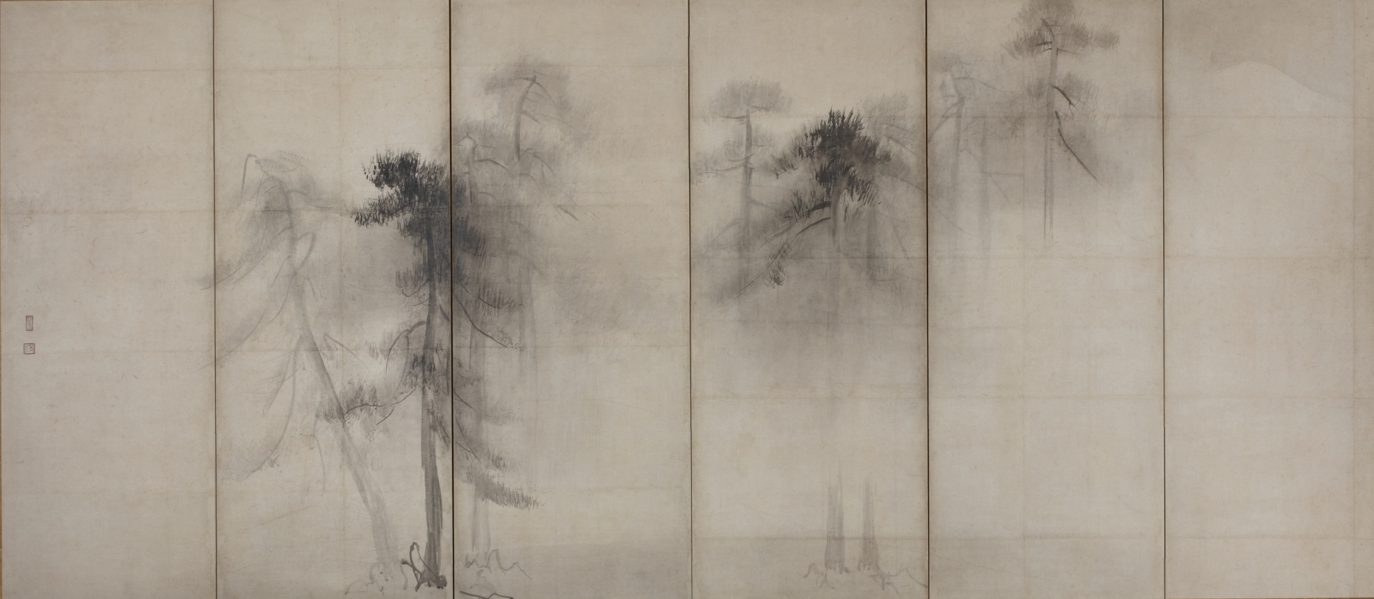 作品詳細:松林という日本の伝統的なモチーフを、中国絵画から学んだ水墨表現によって描き出し、日本の風土の豊かな形象をみごとに表しています。