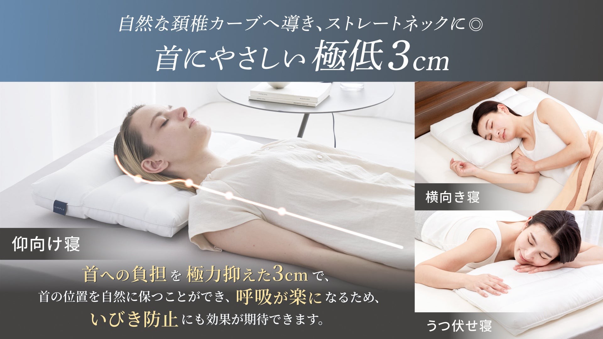 **【極低3cmの枕で首・肩ラクに。呼吸もスムーズ】**