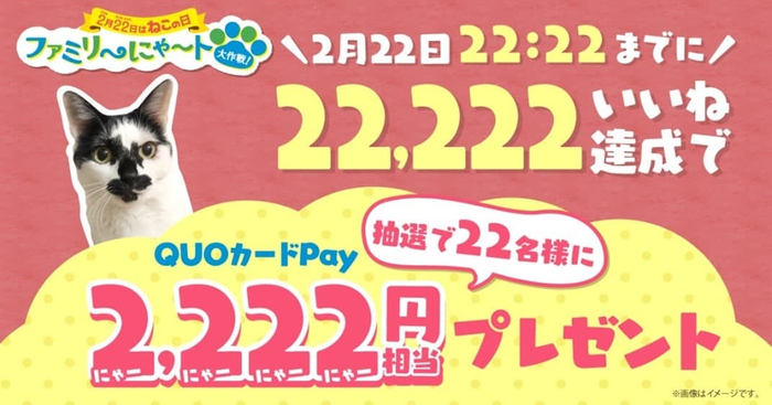 ファミリーマートの公式Xアカウント(@famima_now)において、2月22日(土)14時22分から同日22時22分までに22,222いいねを達成した場合、2,222円相当の「QUOカードPAY」が抽選で22名さまに当たるキャンペーンを実施いたします。