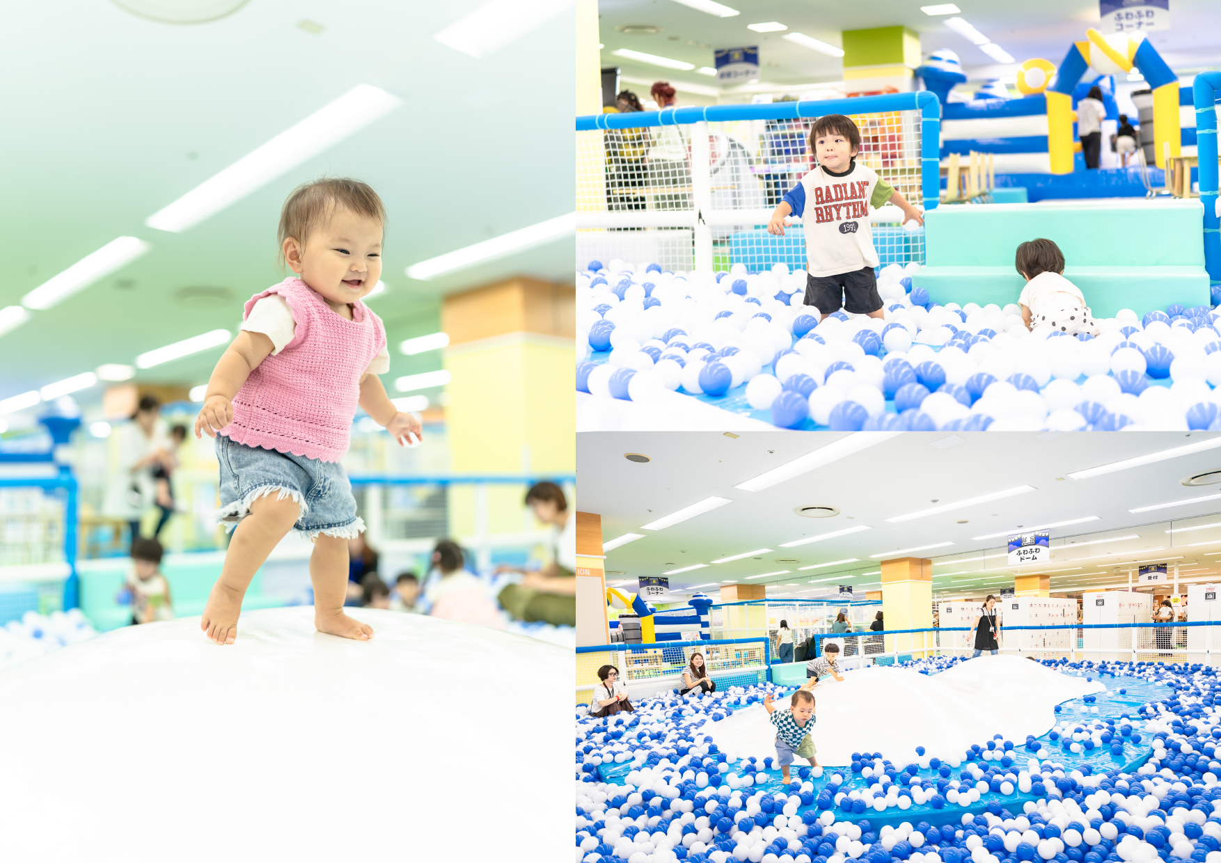 たくさんのボールプールと白いふわふわのお山のエアー遊具で飛んで跳ねて体を動かしてお遊びいただけます。