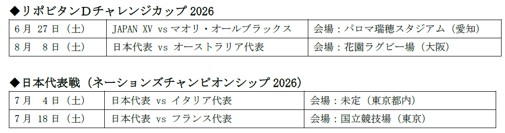 大正製薬株式会社[本社:東京都豊島区 社長:上原 茂](以下、当社)は、公益財団法人日本ラグビーフットボール協会が主催するラグビー日本代表戦2試合について、冠スポンサーとして特別協賛し、「リポビタンDチャレンジカップ2026」として開催することが決定いたしました。